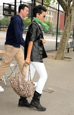 Rihanna foi "apanhada" pelos paparazzi à saída do hotel onde se encontra hospedada em NovaIorque, ontem. A cantora foi muito simpática, chegando mesmo a parar para falar e dar autógrafos aos fãs! Mas o que chamou realmente a atenção foi o seu visual, com destaque para os brincos que iam de orelha a orelha, fazendo um colar e as botas de cano até à coxa! Não gostei, novamente!